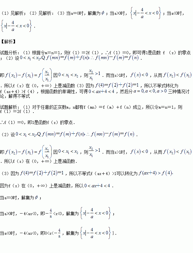 定义在(0,+∞)上的函数f (x),对于任意的m,n∈(0,+∞),都有f (mn)=f (m)+f (n)成立,当x >1时,f (x)< 0.