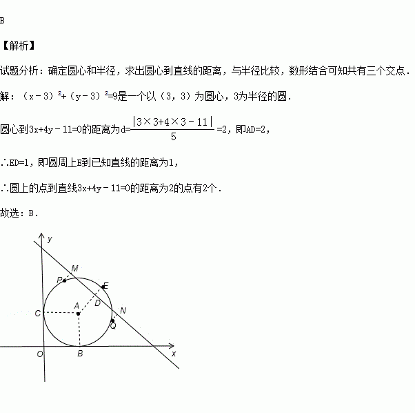 (2015秋•水富县校级月考)圆(x﹣3)2+(y﹣3)2=9上到直线3x+4y﹣11=0的距离等于2的点有( )