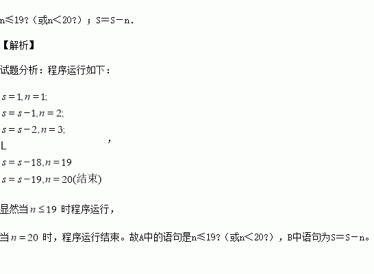 已知数列{an},a1=1,an+1=an-n,计算数列{an}的第20项.现已给出该问题算法的程序框图(如图所示).为使之能完成上述的算法功能,则在下图判断框中(A)处应填上合适的语句是 ;在处理框中(B)处应填上合适的语句是 .