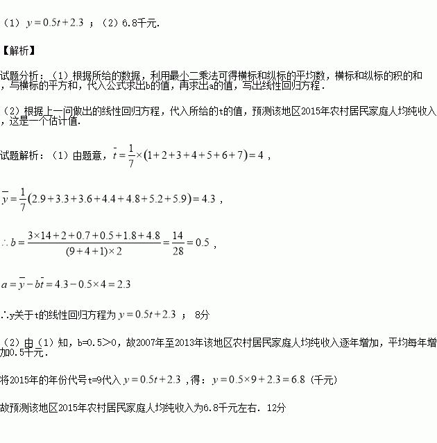 £¨2£©ÀûÓã¨1£©ÖеĻع鷽³Ì£¬·ÖÎö2007ÄêÖÁ2013Äê¸ÃµØÇøÅ©´å¾ÓÃñ¼ÒÍ¥È˾ù´¿ÊÕÈëµÄ±ä»¯Çé¿ö£¬²¢Ô¤²â¸ÃµØÇø2015ÄêÅ©´å¾ÓÃñ¼ÒÍ¥È˾ù´¿ÊÕÈë.