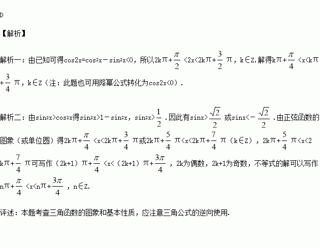 若sin2x>cos2x,则x的取值范围是( )