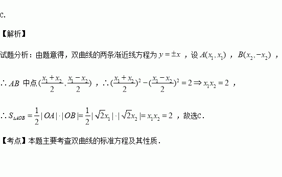 已知直线l与双曲线C:x2-y2=2的两条渐近线分别交于A,B两点,若AB的中点在该双曲线上,O为坐标原点,则△A OB的面积为( )