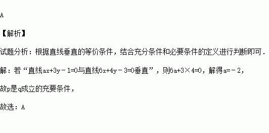 (2015•郑州一模)命题p:“a=﹣2”是命题q:“直线ax+3y﹣1=0与直线6x+4y﹣3=0垂直”成立的( )