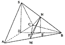 | 解:(Ⅰ)取AC的中点D,连结SD、DB, ∵SA=SC,AB=BC, ∴AC⊥SD且AC⊥BD, ∴AC⊥平面SDB, 又SB ∴AC⊥SB; (Ⅱ)∵AC⊥平面SDB,AC ∴平面SDB⊥平面ABC, 过N作NE⊥BD于E,NE⊥平面ABC, 过E作EF⊥CM于F,连结NF,则NF⊥CM, ∴∠NFE为二面角N-CM-B的平面角, ∵平面SAC⊥平面ABC,SD⊥AC, ∴SD⊥平面ABC, 又∵NE⊥平面ABC, ∴NE∥SD, ∵SN=NB, ∴NE= 在正△ABC中,由平面知识可求得 在Rt△NEF中,tan∠NFE= ∴二面角N-CM-B的大小是arctan2 (Ⅲ)在Rt△NEF中,NF= ∴S△CMN= 设点B到平面CMN的距离为h, ∵VB-CMN=VN-CMB,NE⊥平面CMB, ∴ ∴h= 即点B到平面CMN的距离为 |
