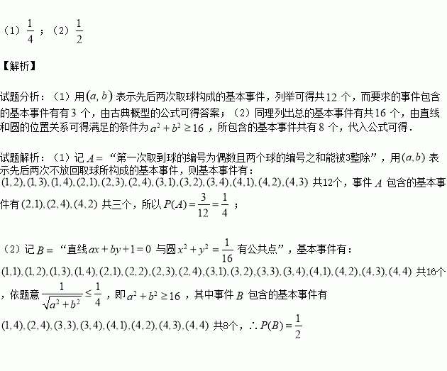(1)若逐个不放回取球两次,求第一次取到球的编号为偶数且两个球的编号之和能被3整除的概率;