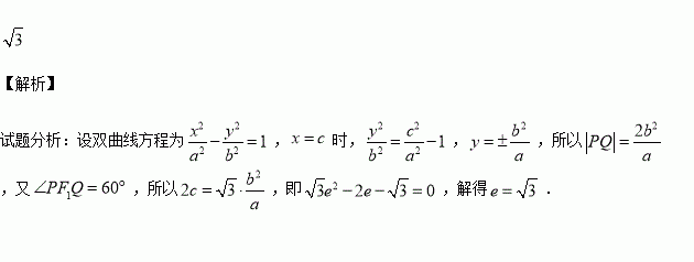 已知F1、F2是双曲线的两焦点,过F2且垂直于实轴的直线交双曲线于P、Q两点,∠PF1Q=60°,则离心率e=______________.