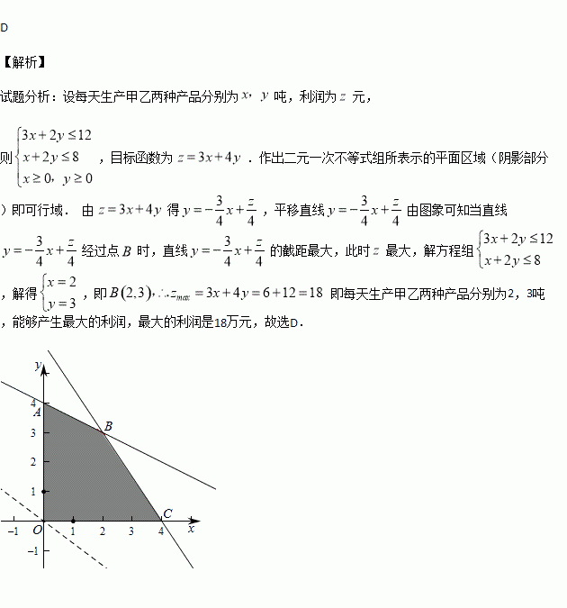 某企业生产甲乙两种产品均需用A,B两种原料,已知生产1吨每种产品需原料及每天原料的可用限额如表所示,如果生产1吨甲、乙产品可获利润分别为3万元、4万元,则该企业每天可获得最大利润为