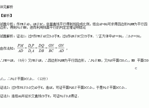 (本小题满分12分)如图所示,正方体ABCD-A1B1C1D1中,P、Q分别是AD1、BD上的点,且AP=BQ,求证:PQ∥平面DCC1D1.
