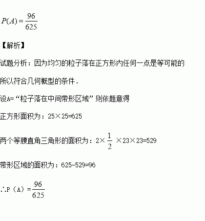 如图,在边长为25Cm的正方形中挖去边长为23Cm的两个等腰直角三角形,现有均匀的粒子散落在正方形中,问粒子落在中间带形区域的概率是多少___________.