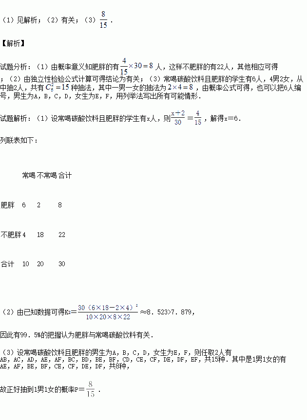 ΪÁ˽âÉÙÄê¶ùͯµÄ·ÊÅÖÊÇ·ñÓë³£ºÈ̼ËáÒûÁÏÓйأ¬ÏÖ¶Ô30ÃûÁùÄ꼶ѧÉú½øÐÐÁËÎʾíµ÷²é£¬µÃµ½ÈçÏÂ2¡Á2ÁÐÁª±í£¬Æ½¾ùÿÌìºÈ500 mlÒÔÉÏΪ³£ºÈ£¬ÌåÖØ³¬¹ý50 kgΪ·ÊÅÖ£®