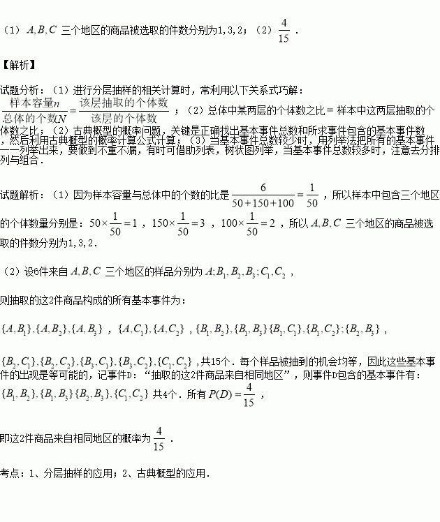 (2)若在这6件样品中随机抽取2件送往甲机构进一步检测,求这2件商品来自相同地区的概率.