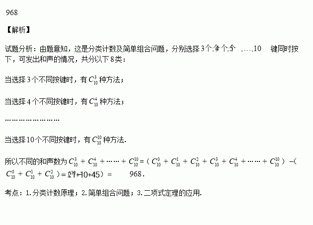 从一架钢琴挑出的十个音键中,分别选择3个,4个,5个,…,10个键同时按下,可发出和声,若有一个音键不同,则发出不同的和声,则这样的不同的和声数为 (用数字作答).