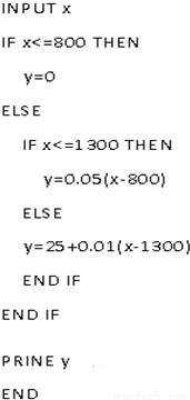 第二步 如果x<=800,那么y=0;如果800<x<=1300,那么 y=0.05(x-800);否则 y=25+0.1(x-1300)