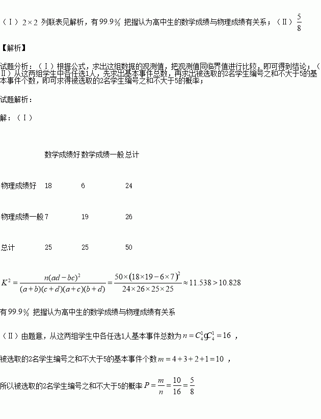 ¹þÈýÖÐijÐËȤС×éΪÁ˵÷²é¸ßÖÐÉúµÄÊýѧ³É¼¨ÊÇ·ñÓëÎïÀí³É¼¨ÓйØÏµ£¬Ôڸ߶þÄê¼¶Ëæ»úµ÷²éÁË50ÃûѧÉú£¬µ÷²é½á¹û±íÃ÷£ºÔÚÊýѧ³É¼¨½ÏºÃµÄ25ÈËÖÐÓÐ18ÈËÎïÀí³É¼¨ºÃ£¬ÁíÍâ7ÈËÎïÀí³É¼¨Ò»°ã£»ÔÚÊýѧ³É¼¨Ò»°ãµÄ25ÈËÖÐÓÐ6ÈËÎïÀí³É¼¨ºÃ£¬ÁíÍâ19ÈËÎïÀí³É¼¨Ò»°ã.