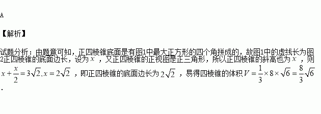 将一张边长为6 cm的纸片按如图l所示阴影部分裁去四个全等的等腰三角形,将余下部分沿虚线折叠并拼成一个有底的正四棱锥(底面是正方形,顶点在底面的射影为正方形的中心)模型,如图2放置.若正四棱锥的正视图是正三角形(如图3),则正四棱锥的体积是( )
