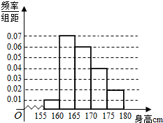 解:(Ⅰ)身高在区间[165,180]的频率为1-5×(0.01+0.07)=0.6,