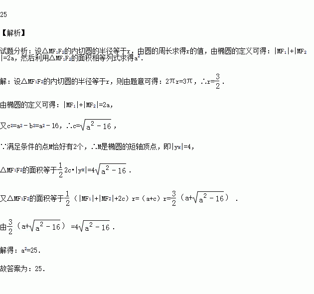 =1的左、右焦点,M为椭圆上一点,且△MF1F2的内切圆的周长等于3π,若满足条件的点M恰好有2个,则a2= .