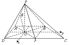| (Ⅱ)证明:由(Ⅰ)知PO⊥平面ABCD, 又AB⊥AD, 所以过O分别做AD,AB的平行线, 以它们作x,y轴,以OP为z轴建立如图所示的空间直角坐标系, 由已知得: 则 ∴ ∴ ∵ ∴OE∥平面PDC; (Ⅲ)解:设平面PDC的法向量为 直线CB与平面PDC所成角θ, 则 令 则平面PDC的一个法向量为 又 则 ∴直线CB与平面PDC所成角的正弦值为 |