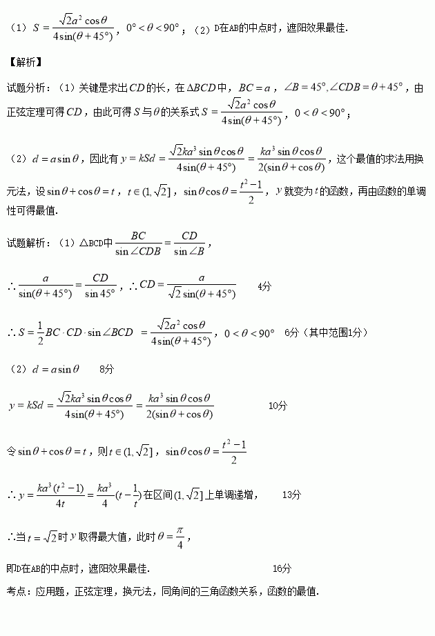 如图(1),有一块形状为等腰直角三角形的薄板,腰AC的长为a米(a为常数),现在斜边AB上选一点D,将△ACD沿CD折起,翻扣在地面上,做成一个遮阳棚,如图(2). 设△BCD的面积为S,点A到直线CD的距离为d. 实践证明,遮阳效果y与S、d的乘积Sd成正比,比例系数为k(k为常数,且k>0).