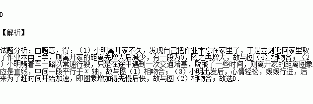(1)小明离开家不久,发现自己把作业本忘在家里了,于是立刻返回家里取了作业本再上学;