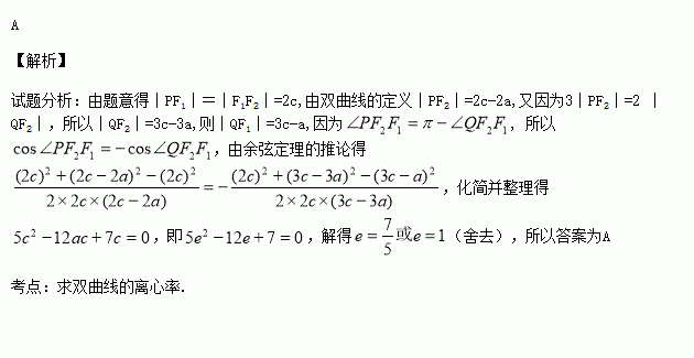 曲线的右支于P,Q两点,若|PF1|=|F1F2|,且3|PF2|=2 |QF2|,则该双曲线的离心率为( )