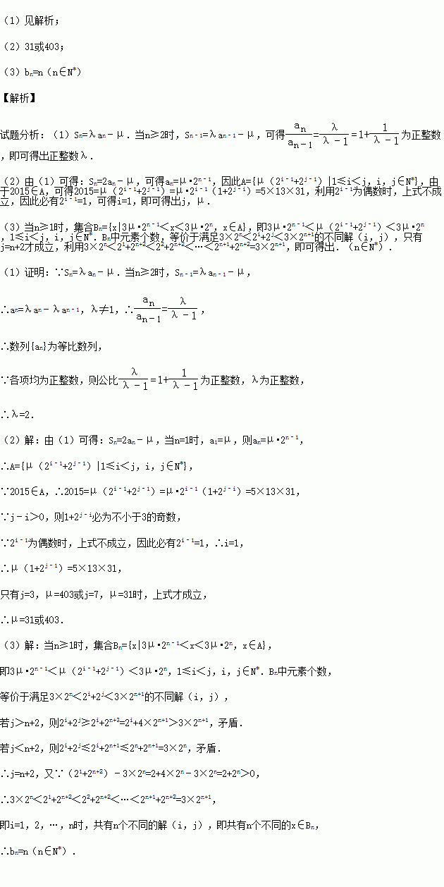 (2015•江苏三模)已知λ,μ为常数,且为正整数,λ≠1,无穷数列{an}的各项均为正整数,其前n项和为Sn,对任意的正整数n,Sn=λan﹣μ.记数列{an}中任意两不同项的和构成的集合为A.