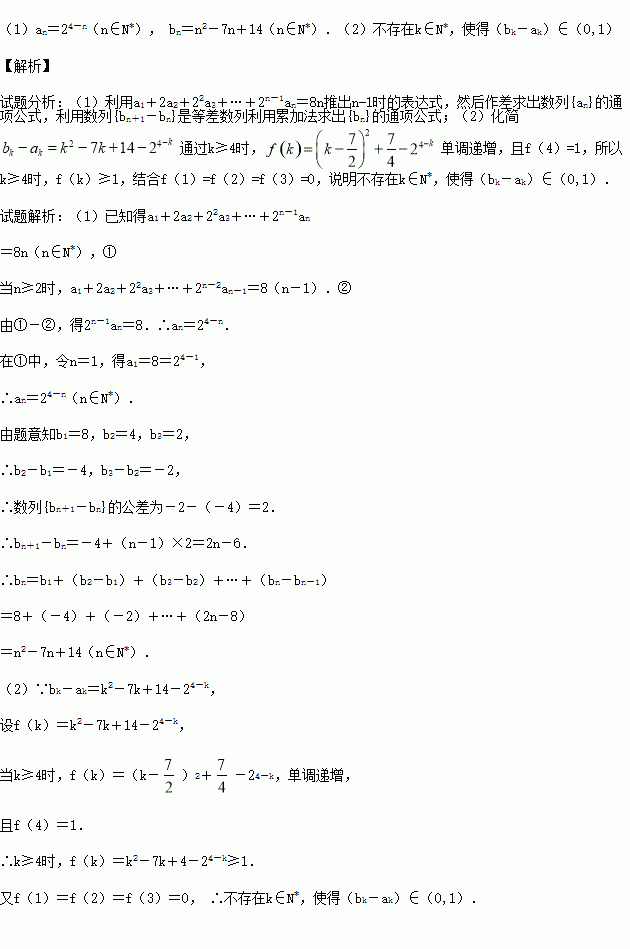 已知数列{an}的前三项与数列{bn}的前三项相同,且a1+2a2+22a3+…+2n-1an=8n对任意n∈N*都成立,数列{bn+1-bn}是等差数列.