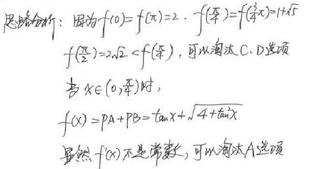如图,长方形ABCD的边AB=2,BC=1,O是AB的中点,点P沿着边BC,CD与DA运动,∠BOP=x。将动点P到AB两点距离之和表示为x的函数f(x),则f(x)的图像大致为