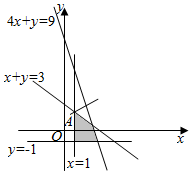 解答 解:由约束条件$\left\{\begin{array}{l}x≥1\\ y≥-1\\ 4x+y≤9\\ x+y≤3\end{array}\right.$作出可行域如图,![]()