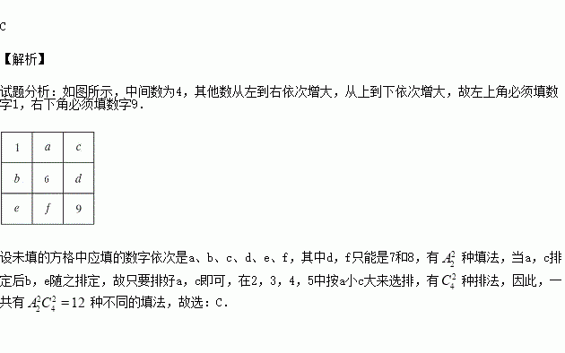 将1、2、3、…9这九个数字填在如图所示的9个空格中,要求每一行从左到右依次增大,每一列从上到下依次增大,当6在图中的位置时,则填写空格的方法有( )