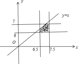 可得由试验的全部结果满足条件为$\left\{\begin{array}{l}{6.5≤x≤7.5}\\{6≤y≤7}\end{array}\right.$,所构成的区域的面积为s=1×1=1.