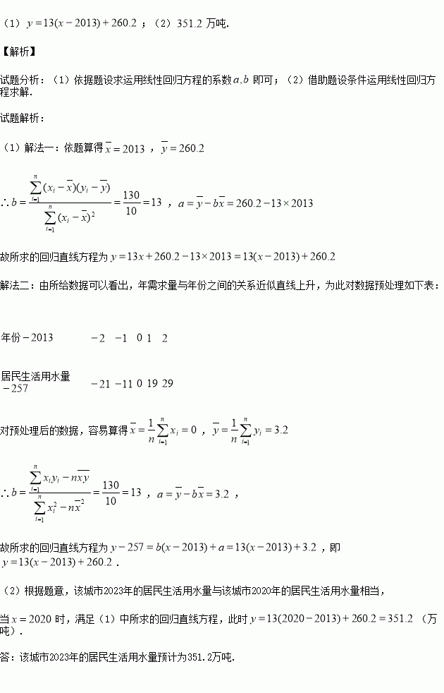 (1)利用所给数据求年居民生活用水量与年份之间的回归直线方程
