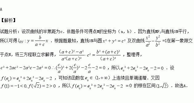 =1(a>0,b>0)的左、右两个焦点,以线段F1F2为直径的圆与双曲线的一条渐近线交于点M,与双曲线交于点N(点M,N均在第一象限),当直线MF1与直线ON平行时,双曲线离心率取值为e0,则e0所在区间为( )