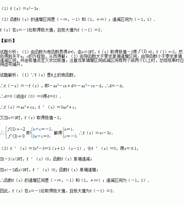 (本小题满分10分)已知函数f(x)=ax3+cx+d(a≠0)是R上的奇函数,当x=1时,f(x)取得极值-2.