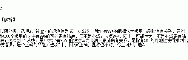 的观测值为6.635,我们有99%的把握认为吸烟与患肺病有关系,那么在100个吸烟的人中必有99人患有肺病;