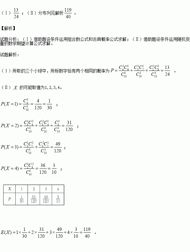 一袋子中有10个大小相同标有数字的小球,其中4个小球标有数字1,3个小球标有数字2,2个小球标有数字3,1个小球标有数字4。从袋子中任取3个小球。