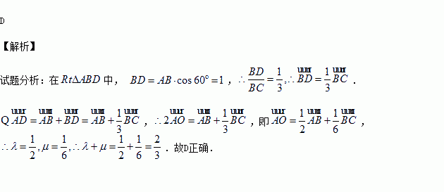 在△ABC中,AB=2,BC=3,∠ABC=60°,AD为BC边上的高,O为AD的中点,若