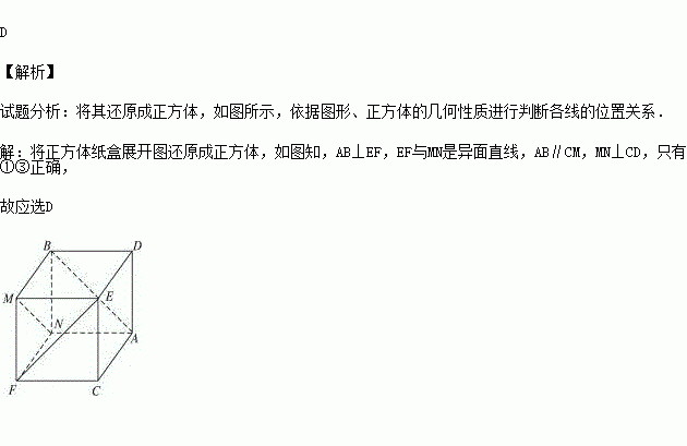 (2014秋•腾冲县校级期末)一个正方体纸盒展开后如图所示,在原正方体纸盒中有下列结论:①AB⊥EF;②AB与CM成60°角;③EF与MN是异面直线;④MN∥CD,其中正确的是( )