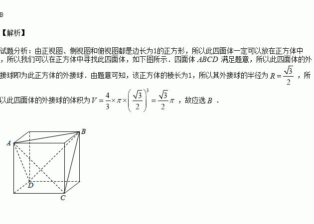 某四面体的三视图如图,正(主)视图、侧(左)视图、俯视图都是边长为1的正方形,则此四面体的外接球的体积为( )