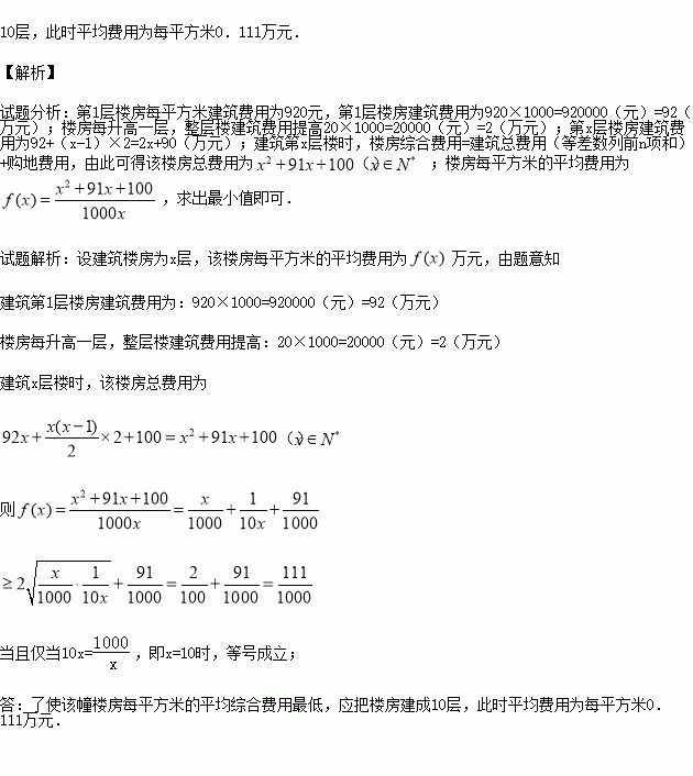 ijÆóҵΪ½â¾öÀ§ÄÑÖ°¹¤µÄס·¿ÎÊÌ⣬¾ö¶¨·ÖÅú½¨Éè±£ÕÏÐÔס·¿¹©¸øÀ§ÄÑÖ°¹¤£¬Ê×Åú¼Æ»®ÓÃ100ÍòÔª¹ºÂòÒ»¿éÍÁµØ£¬¸ÃÍÁµØ¿ÉÒÔ½¨Ôìÿ²ã1000ƽ·½Ã×µÄÂ¥·¿Ò»´±£¬Â¥·¿µÄÿƽ·½Ã×½¨Öþ·ÑÓÃÓ뽨Öþ¸ß¶ÈÓйأ¬Â¥·¿Ã¿Éý¸ßÒ»²ã£¬Õû²ã¥ÿƽ·½Ã×½¨Öþ·ÑÓÃÌá¸ß20Ôª£¬ÒÑÖª½¨ÖþµÚ1²ãÂ¥·¿Ê±£¬Ã¿Æ½·½Ã׵Ľ¨Öþ·ÑÓÃΪ920Ôª£®ÎªÁËʹ¸Ã´±Â¥·¿Ã¿Æ½·½Ã׵į½¾ù·ÑÓÃ×îµÍ£¨·ÑÓðüÀ¨½¨Öþ·ÑÓú͹ºµØ·ÑÓã©£¬Ó¦°ÑÂ¥·¿½¨³É¼¸²ã£¿´Ëʱƽ¾ù·ÑÓÃΪÿƽ·½Ã×¶àÉÙÍòÔª£¿
