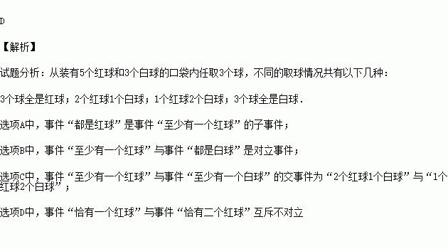 C.至少有一个红球与至少有一个白球 D.恰有一个红球与恰有二个红球
