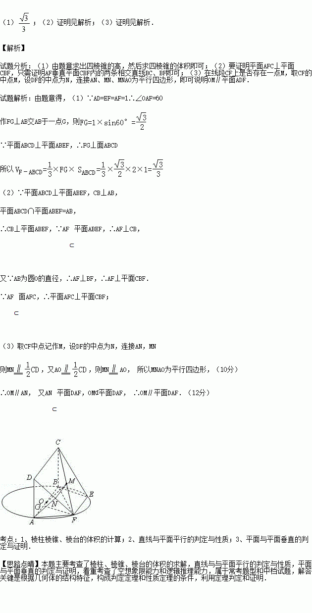 如图,AB为圆O的直径,点E、F在圆O上,且AB∥EF,矩形ABCD所在的平面和圆O所在的平面互相垂直,且AB=2,AD=EF=AF=1.