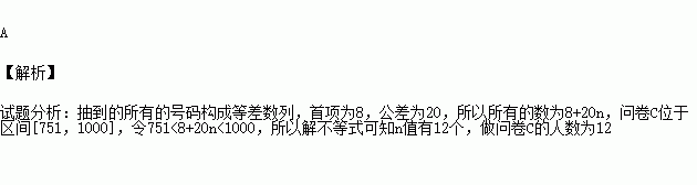 采用系统抽样方法从1000人中抽取50人做问卷调查,为此将他们随机编号为1,2,…,1000,适当分组后在第一组采用简单随机抽样的方法抽到的号码为8.抽到的50人中,编号落入区间[1,400]的人做问卷A,编号落入区间[401,750]的人做问卷B,其余的人做问卷C.则抽到的人中,做问卷C的人数为( )