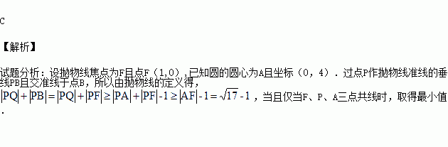 已知P为抛物线y2=4x上一个动点,Q为圆x2+(y-4)2=1上一个动点,那么点P到点Q的距离与点P到抛物线的准线的距离之和的最小值是( )