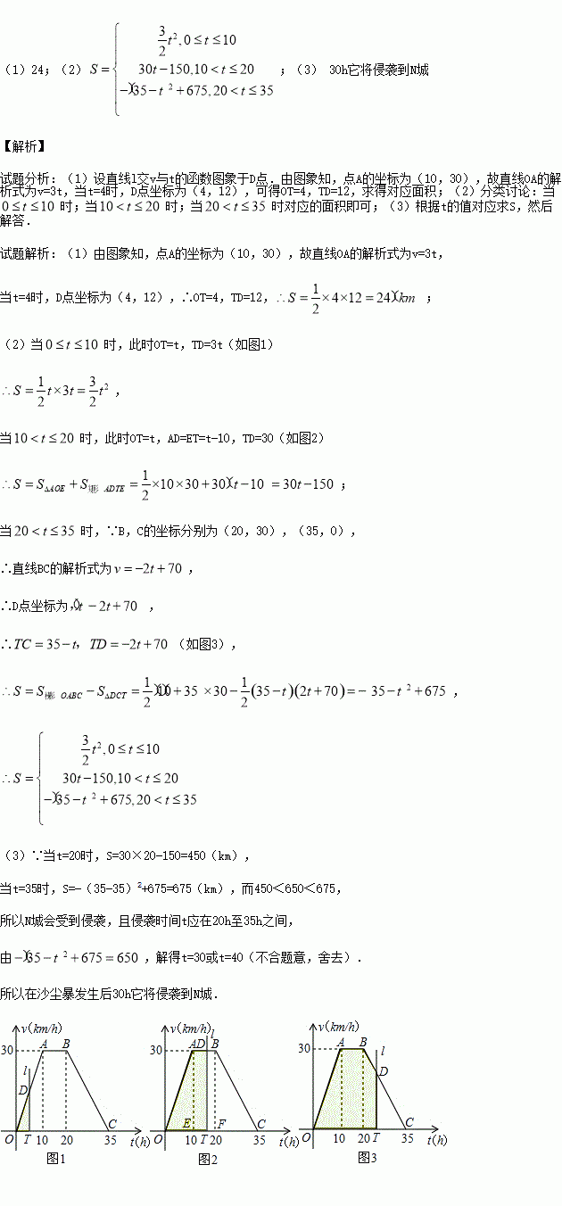 据气象中心观察和预测:发生于M地的沙尘暴一直向正南方向移动,其移动速度v(km/h)与时间t(h)的函数图象如图所示,过线段OC上一点T(t,0)作横轴的垂线