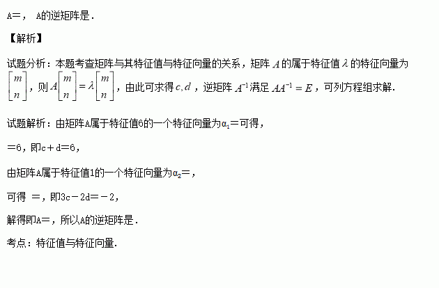 已知矩阵A=,若矩阵A属于特征值6的一个特征向量为α1=,属于特征值1的一个特征向量为α2= .求矩阵A,并写出A的逆矩阵.