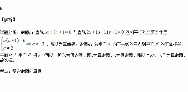 ;命题q:若平面α内不共线的三点到平面β的距离相等,则α//β.下列结论中正确的是( )