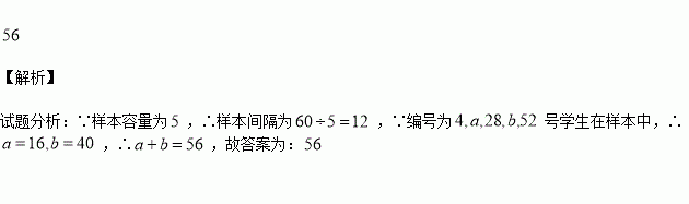 某班有学生60人,现将所有学生按1,2,3,…,60随机编号,若采用系统抽样的方法抽取一个容量为5的样本(等距抽样),已知编号为4,