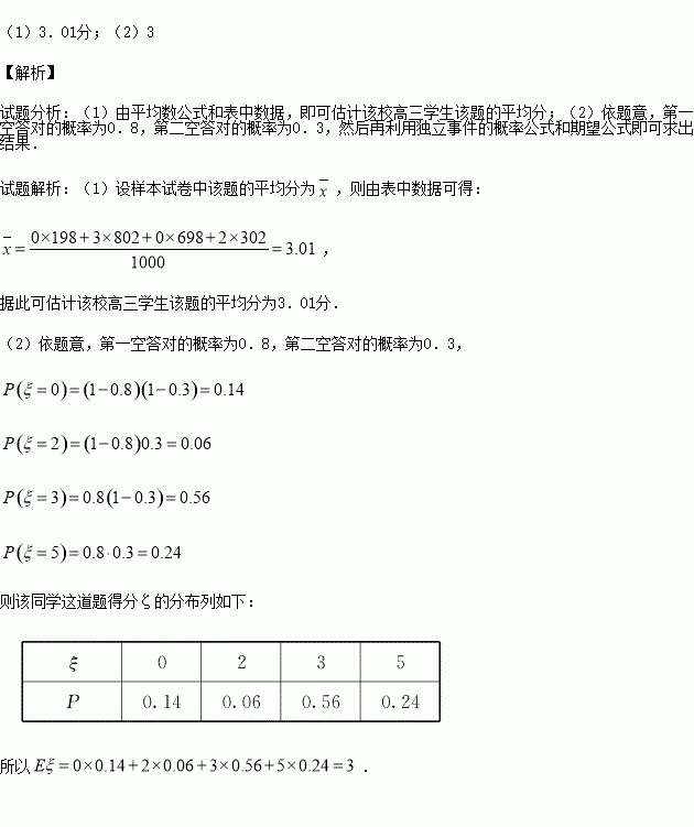 (1)求样本试卷中该题的平均分,并据此估计该校高三学生该题的平均分.
