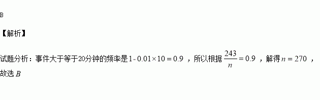 某健康协会从某地区睡前看手机的居民中随机选取了n人进行调 查,得到如右图所示的频率分布直方图.已知睡前看手机时间不低于20分钟的有243人,则n的值为( )